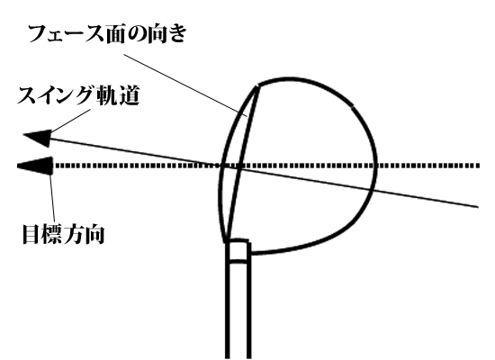 上の図の場合、クラブヘッドの進行方向に対してフェースは右を向いていません。